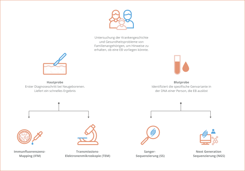 Die ersten Schritte der Diagnose sind eine umfangreiche Analyse der Krankengeschichte von Familienangehörigen und die klinische Beurteilung der Patient*innen. Dafür werden in detaillierten körperlichen Untersuchungen (z. B. Orte und Schwere der Blasenbildung, Vorliegen von Nagelbrüchigkeit) sowie Labor- und Bildgebungsverfahren die Symptome und weitere messbare Krankheitszeichen dokumentiert und bewertet. Für eine sichere Diagnose werden anschließend noch spezielle Methoden wie das Immunfluoreszenz-Mapping (IFM) und die Gendiagnostik durchgeführt.