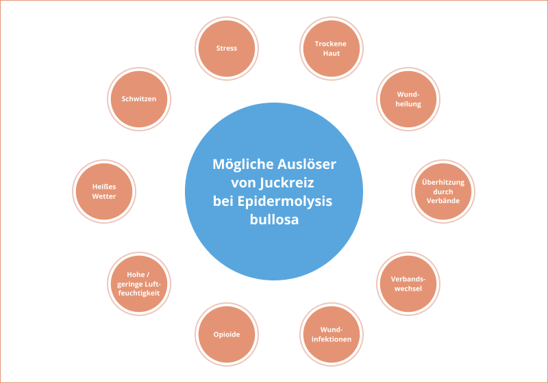 Menschen mit Epidermolysis bullosa (EB) leiden häufig auch unter anhaltendem und starkem Juckreiz, was die Lebensqualität zusätzlich stark belastet. Dabei kann leicht ein Teufelskreis aus Kratzen als Reaktion auf den Juckreiz, erhöhter Hautirritation, Blasenbildung bzw. Ausweitung bestehender Wunden und erhöhtem Infektionsrisiko entstehen. Daher widmen Ärzt*innen diesem Symptom besondere Aufmerksamkeit13. Gemeinsam mit den Betroffenen suchen sie nach möglichen Auslösern, die den Juckreiz verursachen bzw. verstärken, und entwickeln im Anschluss individuelle Strategien zur Behandlung.