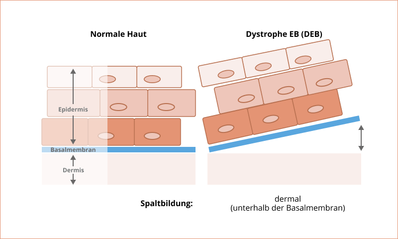 Menschen mit dystropher Epidermolysis bullosa (DEB) zeigen eine Blasenbildung unterhalb der Basalmembran. Insgesamt weisen ca. 25 % der EB-Betroffenen eine DEB auf. Abhängig vom Subtyp erfolgt die Vererbung autosomal-rezessiv oder autosomal-dominant, wobei die rezessiv vererbten Typen meistens schwerwiegendere Krankheitsverläufe zur Folge haben2,9.