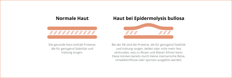 Die Haut besteht aus mehreren Schichten, den sogenannten Epithelschichten. Diese bilden gemeinsam das Epithelgewebe, das von speziellen Strukturproteinen zusammengehalten, stabilisiert und an darunterliegende Gewebe verankert wird. Bei Menschen mit Epidermolysis bullosa (EB) führen Genmutationen, also Veränderungen eines Gens in der Erbinformation, zu einer fehlerhaften Herstellung dieser wichtigen Proteine. Infolgedessen verlieren die Hautschichten ihre nötige Stabilität und Haftfähigkeit, was zu einer besonderen Verletzlichkeit führt. Nach aktuellem Stand der Wissenschaft konnten bislang 16 verschiedene Gene identifiziert werden, deren Mutation mit einer EB in Verbindung steht2.
