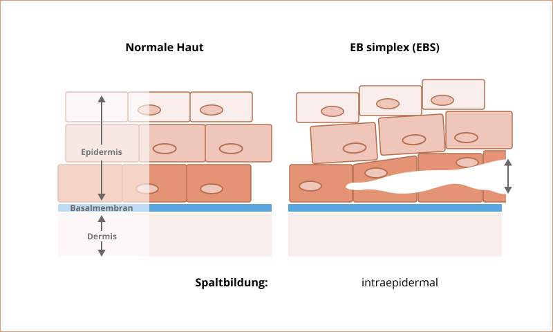 Epidermolysis bullosa simplex (EBS) ist der häufigste EB-Krankheitstyp und macht ungefähr 70 % aller Krankheitsfälle aus. Die Blasenbildung bei der EBS erfolgt vor allem in den höheren Hautschichten oder in den auf der Basalmembran aufliegenden Keratinozyten. Dabei handelt es sich um spezielle Zellen, die für die Produktion von Keratin (Hornsubstanz) zuständig sind. Die EBS wird bis auf wenige Ausnahmen autosomal-dominant vererbt. Nur in ca. 5 % der Fälle liegt ein autosomal-rezessives Vererbungsmuster vor2.