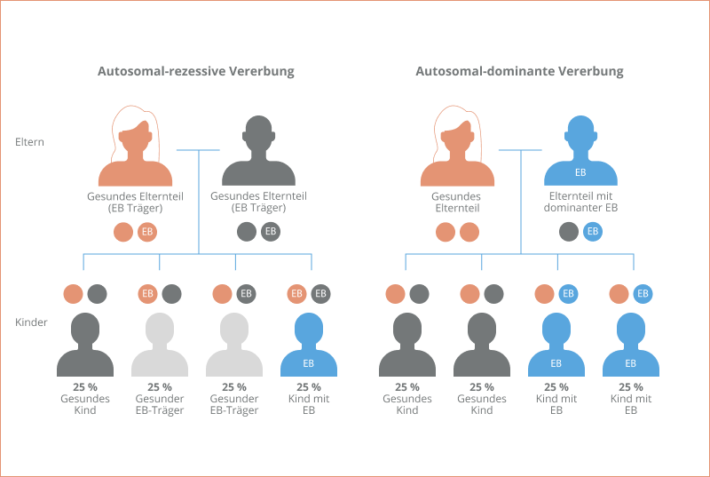 Während bei allen vier Krankheitstypen ein autosomal-rezessives Vererbungsmuster auftritt, ist bei der EB simplex und der dystrophen EB darüber hinaus auch eine autosomal-dominante Vererbung möglich. Dabei reicht die Weitergabe nur eines mutierten Gens von Mutter oder Vater aus, um eine EB-Erkrankung auszulösen. In diesem Fall kann das nichtmutierte Gen die Funktion des mutierten Gens nicht übernehmen. Das Risiko, dass unter diesen Umständen ein Kind an EB erkrankt, liegt statistisch gesehen bei 50 %1,7.