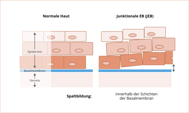 Bei der junktionalen Epidermolysis bullosa (JEB) werden Blasen an der Basalmembran zwischen der oberen Hautschicht (Epidermis) und der darunterliegenden Bindegewebsschicht (Dermis) gebildet. Die JEB macht ungefähr 5 % aller EB-Fälle aus und wird autosomal-rezessiv vererbt2.